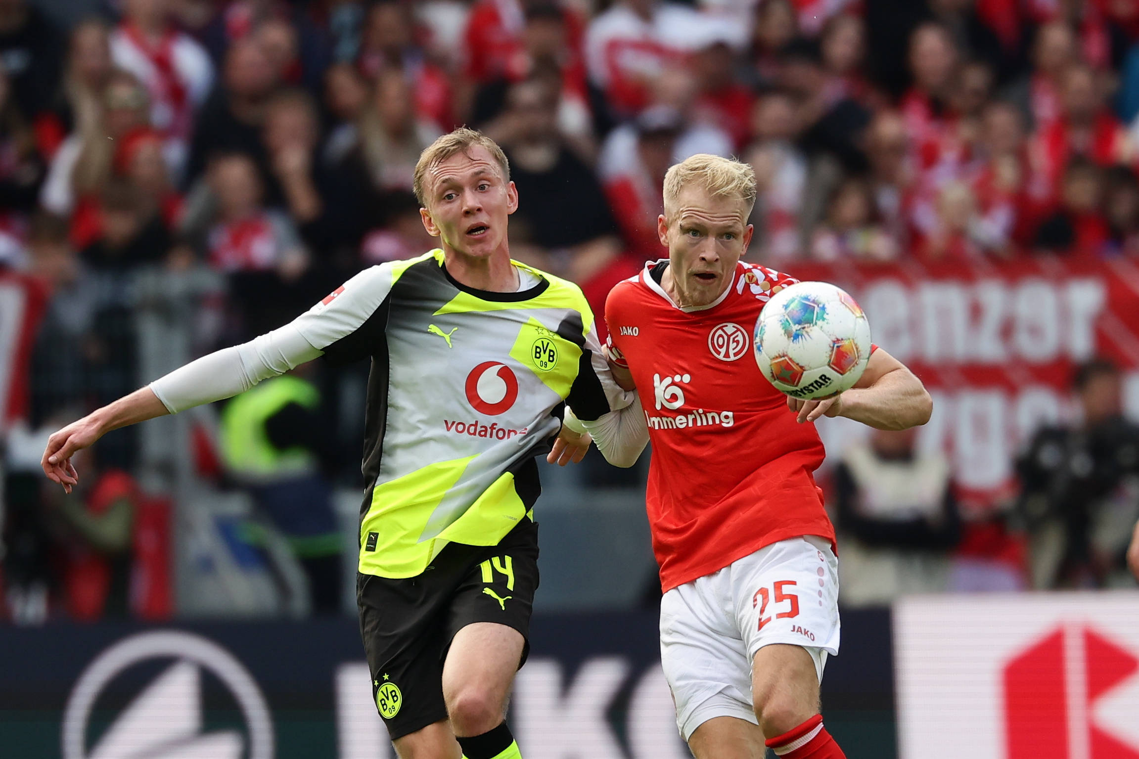 9月27日,多特蒙德队球员拜尔(左)和美因茨队球员奥尔森在比赛中拼抢。 新华社发(约阿希姆·毕瓦勒兹摄)
